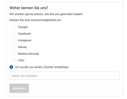 - Nach Abschluss der Bestellung klickt der geworbene Züchter auf der Dankesseite auf den Button „Ich wurde von einem Züchter angeworben“.